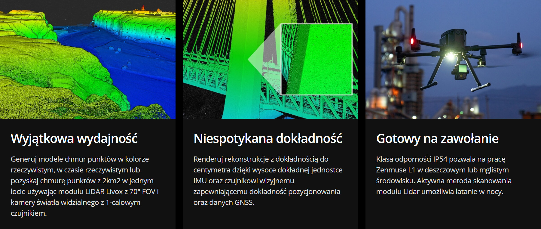Zenmuse L1 posiada moduł laserowy Livox Lidar, moduł IMU o wysokiej dokładności oraz kamerę z 1-calową matrycą CMOS na 3-osiowym stabilizowanym gimbalu. W połączeniu z Matrice 300 RTK i DJI Terra, L1 tworzy kompletne rozwiązanie, które dostarcza dane 3D w czasie rzeczywistym, skutecznie rejestrując szczegóły złożonych struktur i dostarczając bardzo dokładne zrekonstruowane modele.