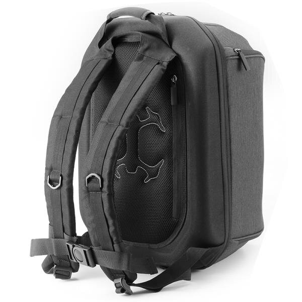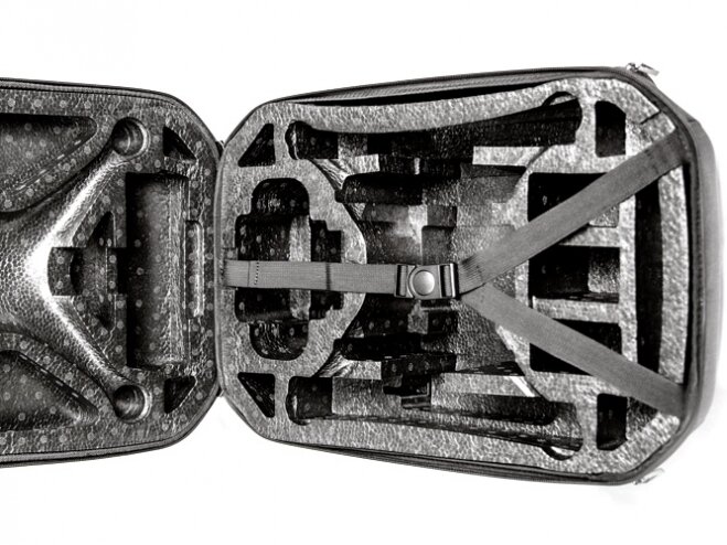 Materiałowy wzmacniany plecak dla Phantom 3 wraz z akcesoriami: nadajnikiem radiowym, bateriami, śmigłami i ładowarką.