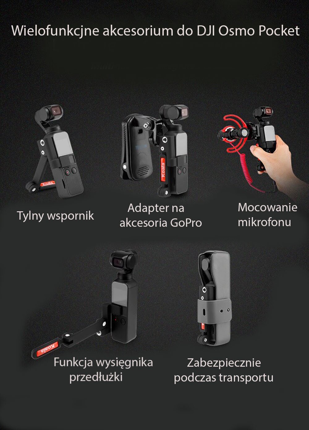 Uniwersalne akcesorium dedykowane do kieszonkowej kamery Dji Osmo Pocket. Umożliwia montaż wszystkich akcesoriów znanych z kamer GoPro, mikrofonu, lampy LED oraz wielu innych. Pełni również funkcję statywu, podpórki, przedłużki oraz posiada dodatkowe zabezpieczenie podczas transportu.