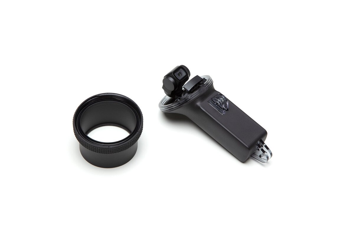 Precyzyjne dopasowanie wewnątrz obudowy zabezpiecza Osmo Pocket, unikając niepożądanych ruchów. Wodoodporna obudowa zawiera również dwa wsporniki montażowe, które umożliwiają przymocowanie obudowy do innego sprzętu. Dwa przyciski na zewnątrz zapewniają precyzyjną kontrolę Osmo Pocket.