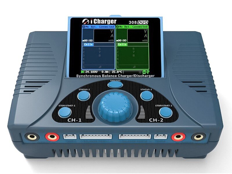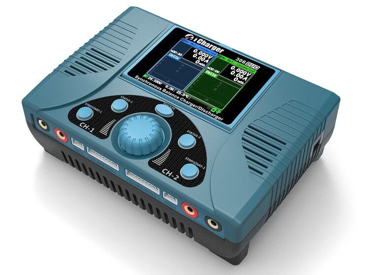 iCharger 308 DUO to zaawansowana ladowarka procesorowa o duzych mozliwosciach. Obsluguje wszystkie stosowane w modelarstwie typy akumulatorów : Ni-Cd, Ni-Mh, Ni-Zn, Li-Po, Li-Io, Li-Fe, Pb. Posiada wbudowany balancer 2-8s dla Li-xx. Mozliwosc ladowania oraz rozladowywania. Przejrzysty wyswietlacz alfanumeryczny. Stosunkowo niewielkie wymiary sprawiaja ze ladowarka ta jest poreczna i wygodna w użyciu. Ładowarka posiada dwa niezalezne kanaly, umowliwiajace ladowanie dwoch apkietow jednoczesnie.