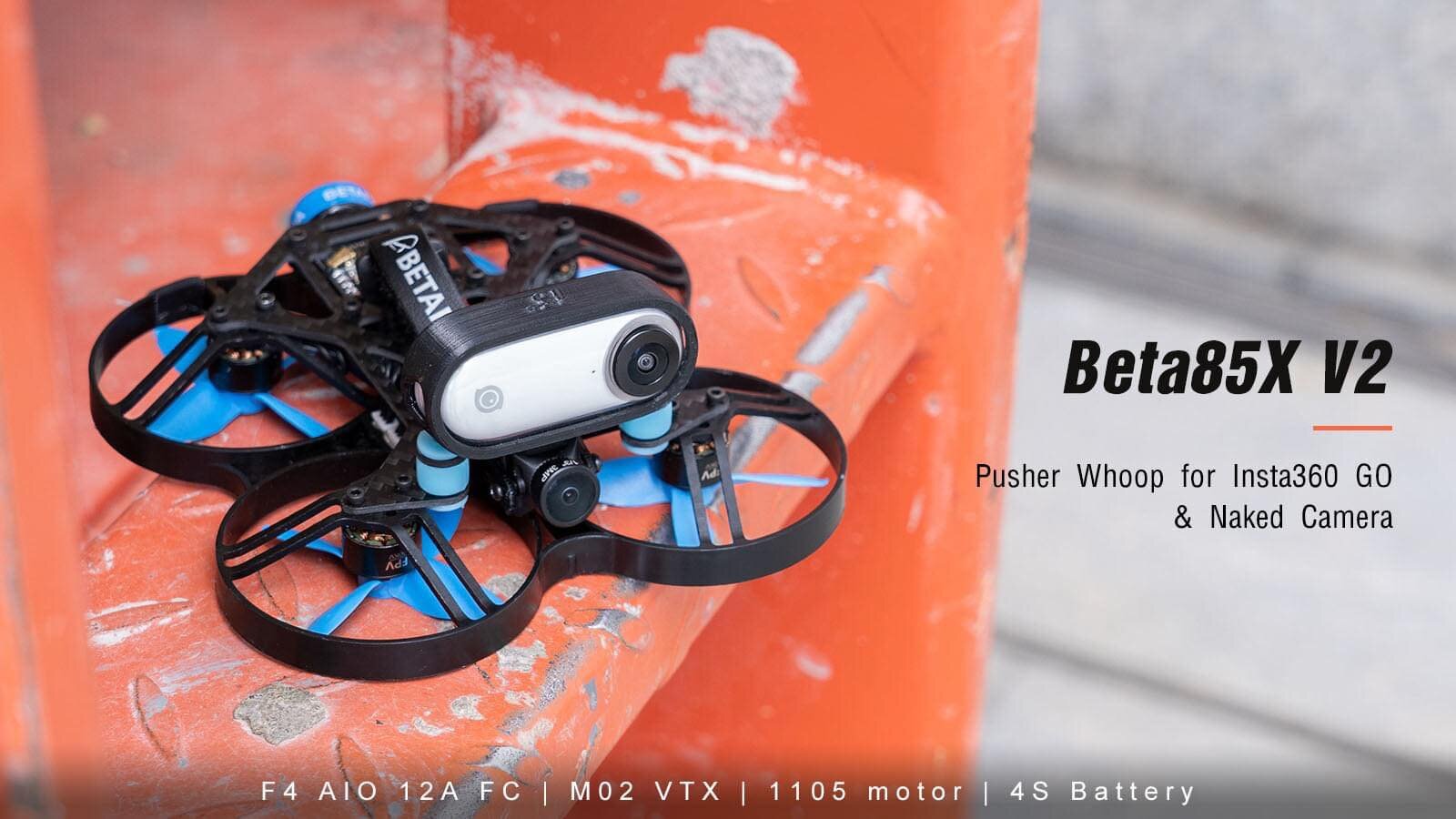 Beta85X V2 to nowy quadrocopter w stylu whoop. Wyposażony został w dwie opcje mocowania kamery Insta360 GO i GoPro Naked. Dzięki 4-łopatkowym śmigłom Gemfan 2020, silnikom 1105 i F4 AIO 12A FC, możemy nakręcić płynne ujęcia kinowe.