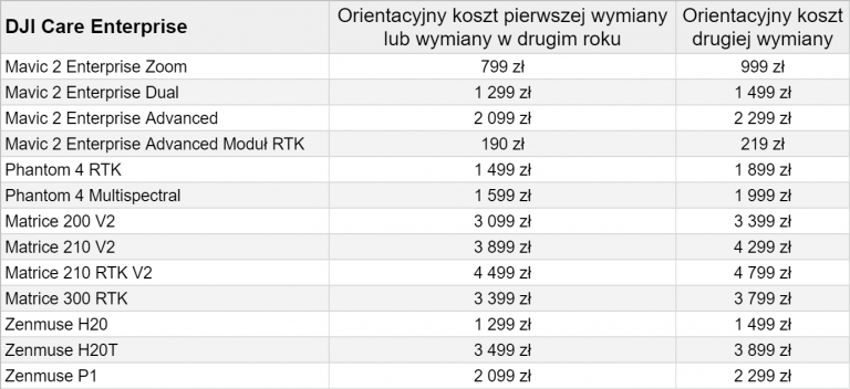 Wybierz plan i praktykuj bezpieczny lot. Cennik (brutto) planu DJI Care Enterprise poniżej.