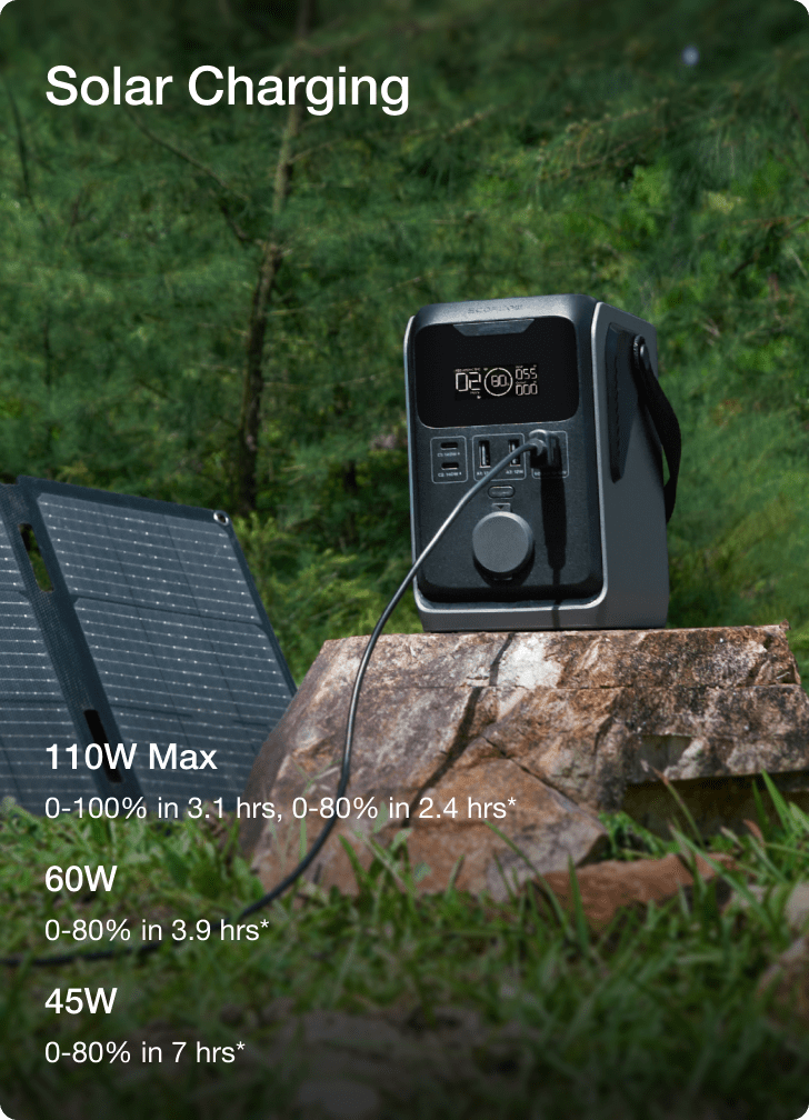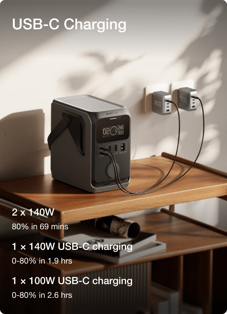 Model TRAIL 300 DC może być ładowany na różne sposoby. Za pomocą dwóch portów USB-C PD 140 W naładujesz go do 80% w około 69 minut. Zajmij się pakowaniem na wyprawę, a zanim skończysz, stacja będzie już gotowa do działania! Możesz też ładować ją przy użyciu paneli fotowoltaicznych 110 W (do 80% w około 2,4 godziny) lub w samochodzie (do 80% w około 2,6 godzin). Takie rozwiązanie świetnie sprawdzi się podczas podróży! Z EcoFlow TRAIL 300 DC zapewnisz sobie dostęp do prądu, gdziekolwiek się znajdziesz.