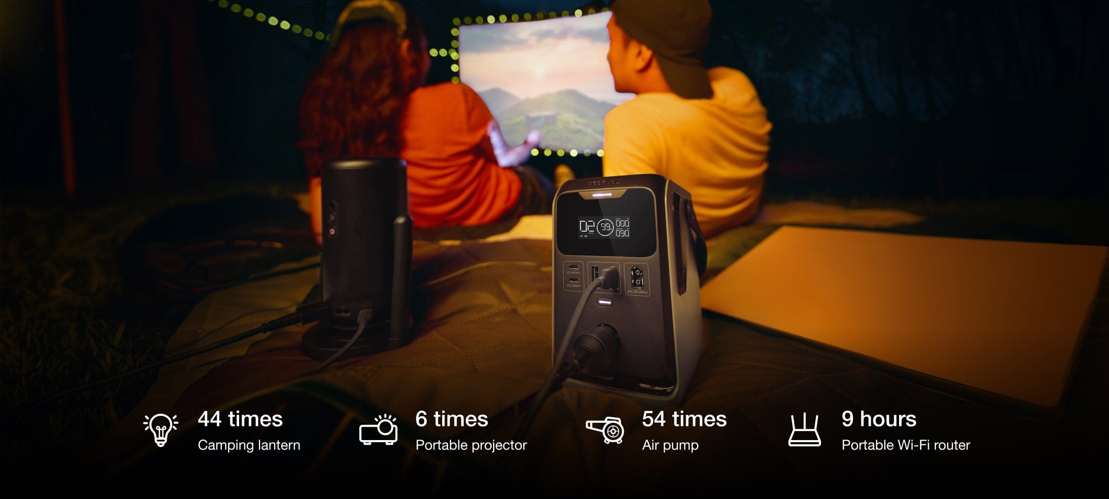 Pojemność 288 Wh oznacza więcej godzin działania niezbędnych sprzętów – dla przykładu, latarka kempingowa może świecić nawet przez 44 godziny, telefon naładujesz do pełna około 16 razy, a mała chłodziarka będzie pracować prawie przez całą dobę (około 23 godzin). Dzięki temu możesz w pełni cieszyć się wypadami w teren!