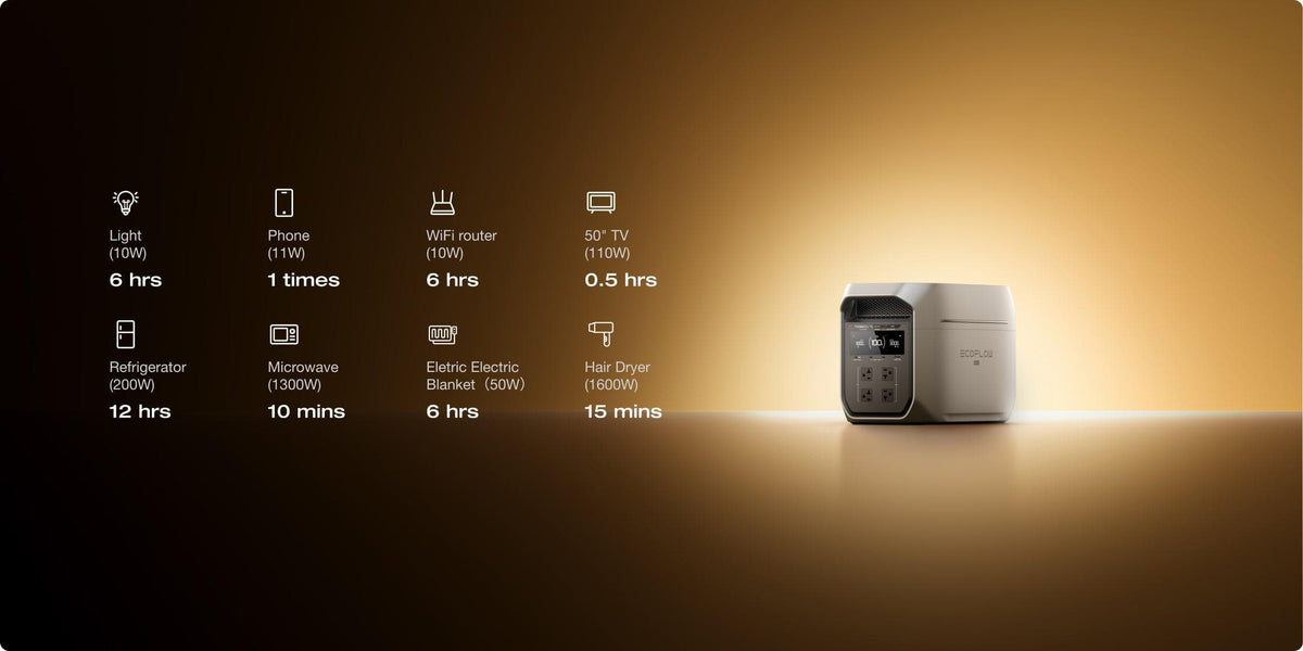 * Wymaga podłączenia 1 x DELTA 3 Max Plus + 2 x DELTA Pro 3 Smart Extra Battery lub 1 x DELTA 3 Max Plus + 2 x DELTA 3 Max Plus Smart Extra Battery z adapterem rozszerzającym EcoFlow Smart Extra Battery. Adapter rozszerzający EcoFlow Extra Battery będzie dostępny w sprzedaży lokalnej w USA około stycznia 2026 roku.