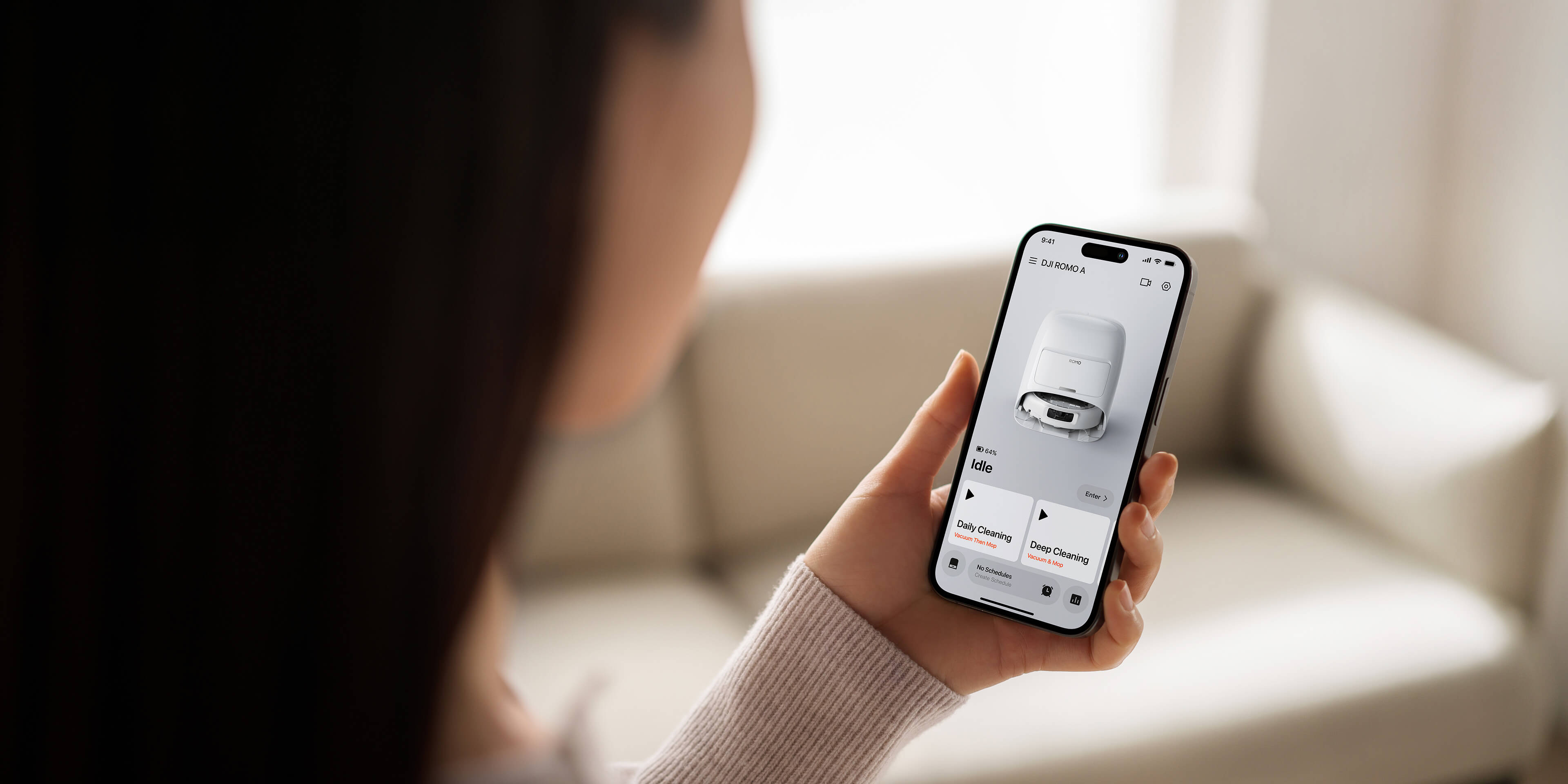 Z aplikacją DJI Home możesz zarządzać robotem zdalnie – z dowolnego miejsca. Ustaw harmonogram, wybierz tryb pracy lub stwórz własny plan sprzątania dostosowany do Twojego rytmu dnia. Otrzymasz też powiadomienia, np. o konieczności uzupełnienia wody w zbiorniku. Dzięki funkcji połączeń wideo możesz zobaczyć, co dzieje się w domu, porozmawiać z domownikami lub uspokoić pupila. Kamera wymaga dwuskładnikowego uwierzytelnienia, a transmisja wideo jest szyfrowana i może zostać całkowicie wyłączona w każdej chwili.