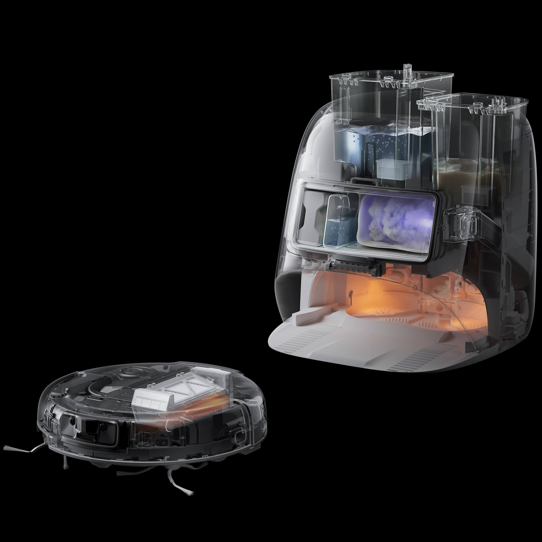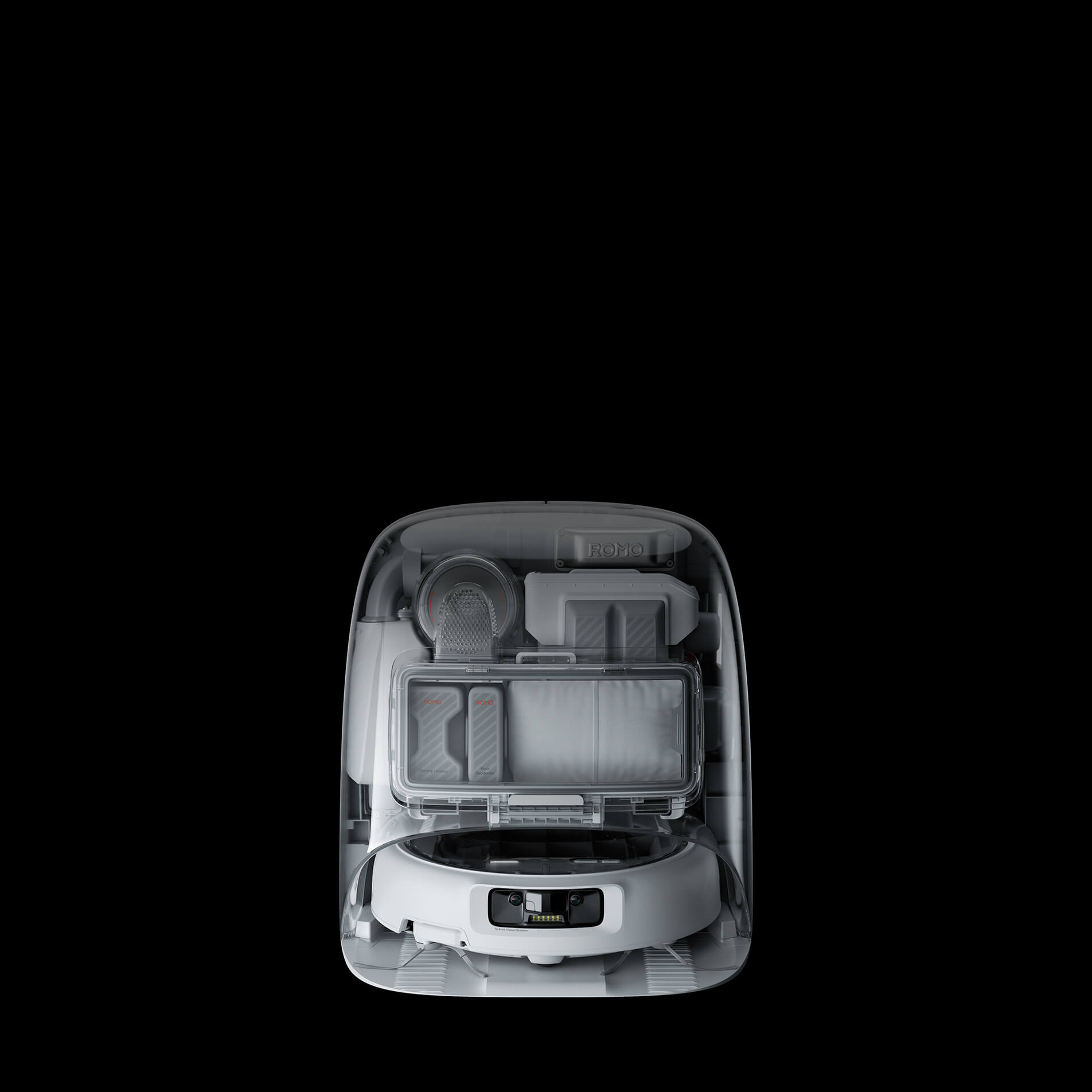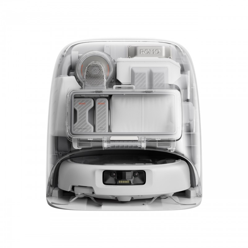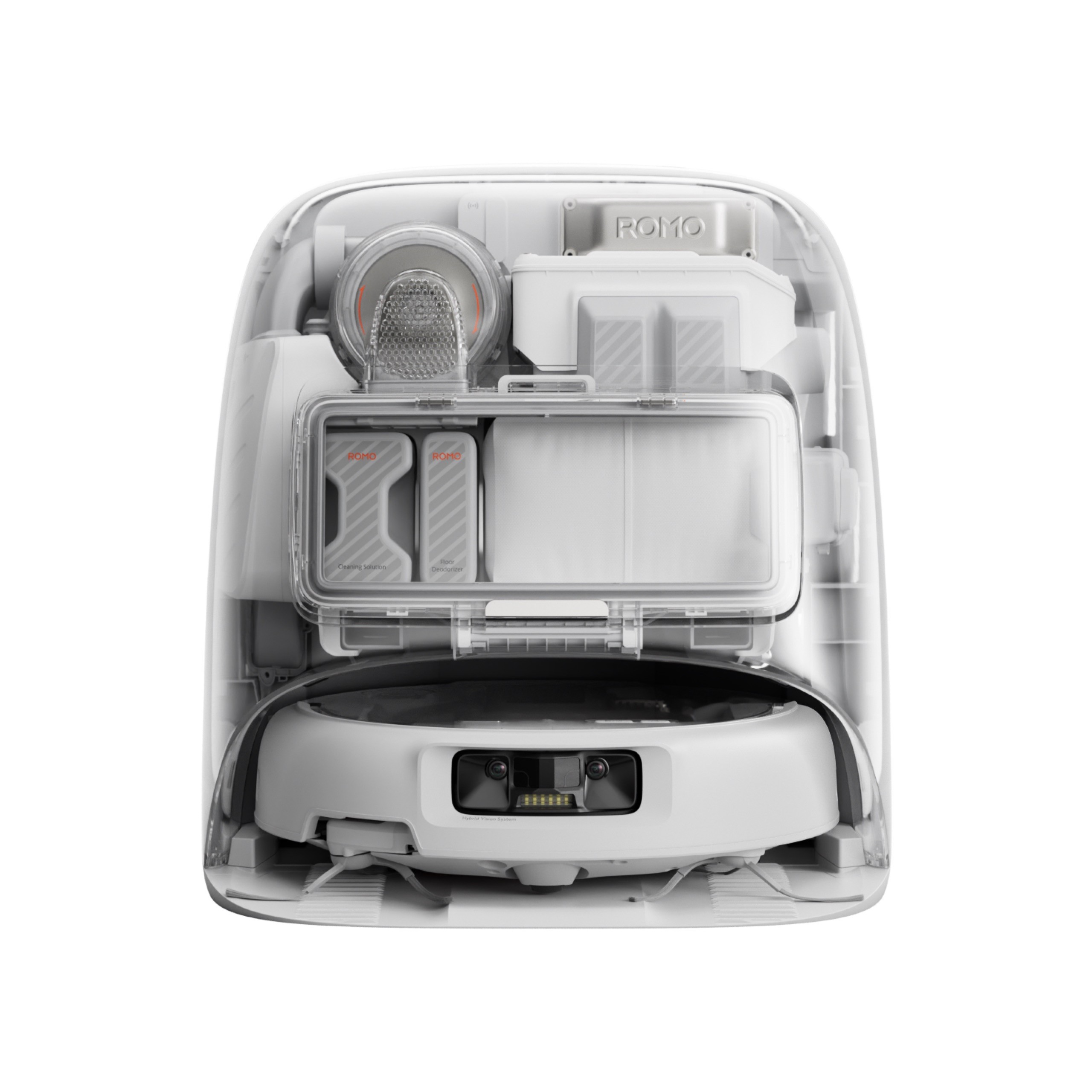 DJI ROMO P i jego stacja wyróżniają się eleganckim designem – przezroczyste elementy obudowy pozwalają zajrzeć do środka i zobaczyć technologię w akcji. Urządzenie jest nie tylko funkcjonalne, ale również estetyczne – świetnie wpisze się w każdy nowoczesny dom.