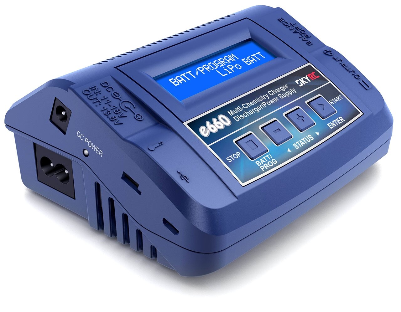 SkyRC e660, ulepszona wersja ładowarki e6650, to nie tylko zoptymalizowany model i więcej funkcji. Ergonomiczna konstrukcja gwarantuje wygodę obsługi, a bezpieczeństwo zapewnia szereg różnych zabezpieczeń odcięcia zasilania tzn. termiczne, prądowe, pojemnościowe itd. Urządzenie posiada wbudowany balanser i jest w stanie ładować akumulatory z mocą 60 W i natężeniem 6A.