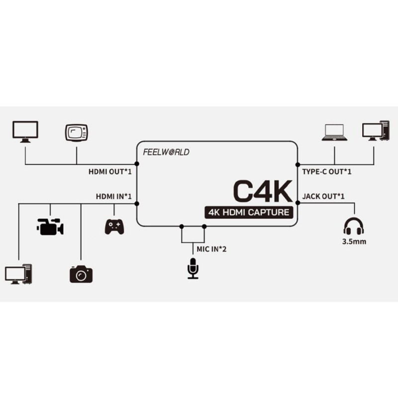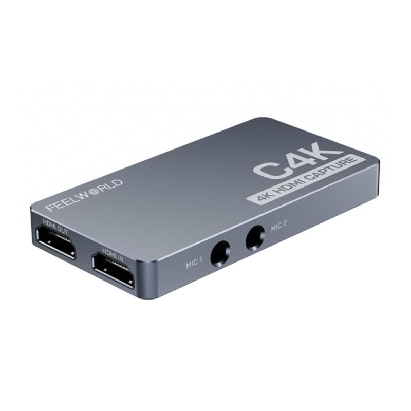 Feelworld C4K to kompaktowa karta przechwytująca z wejściem i wyjściem obsługującymi sygnał HDMI 4K 60 Hz. Działa przez USB‑C i nie wymaga instalowania sterowników. Idealna do streamingu, gamingu i prowadzenia wideokonferencji. Oferuje wysokie odświeżanie, obsługę audio, tryb loop-out oraz wsparcie VRR. Kompatybilna z systemami Windows, macOS i Linux.